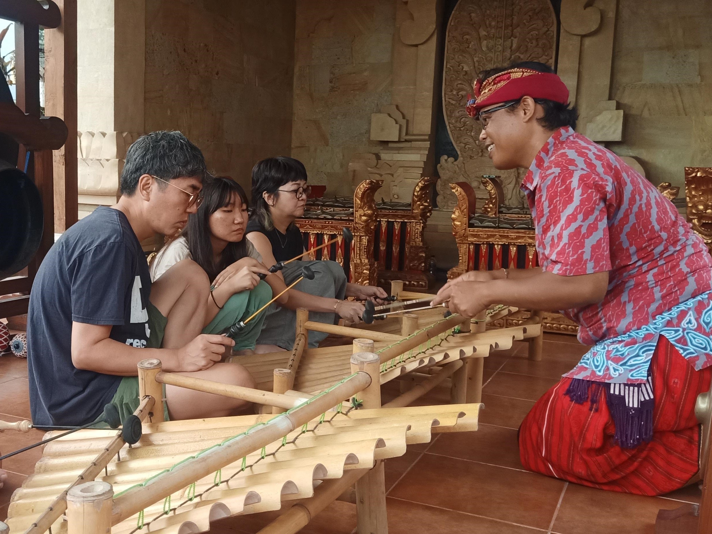 ホテルやアクティビティ会社でも、ガムランの講座を設けているところはありますが、講師のカデ・スジャナは、宗教儀式での演奏はもちろんのこと、伝統ある有名楽団の主要メンバーとして、観光客向けの芸能定期公演や高級リゾートホテルのディナーショー、国際会議等でバリ島を訪れるVIP達を歓待するための特別ステージなど、第一線で演奏活動を続けています。多種多様なガムラン楽器を自在に操ることができ、かつ日本語も堪能という講師は、バリ島広しといえども稀有な存在と言えます。